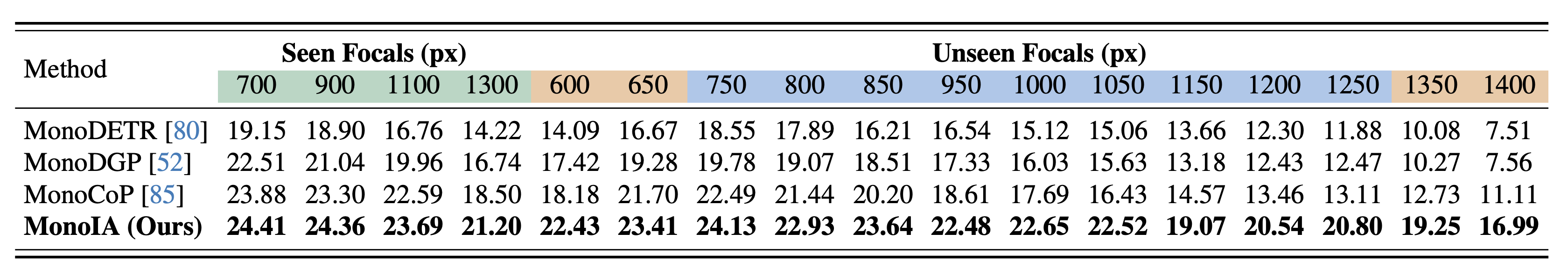 MonoIA achieves the highest AP3D across all focal lengths and maintains strong robustness even under extrapolated intrinsics.