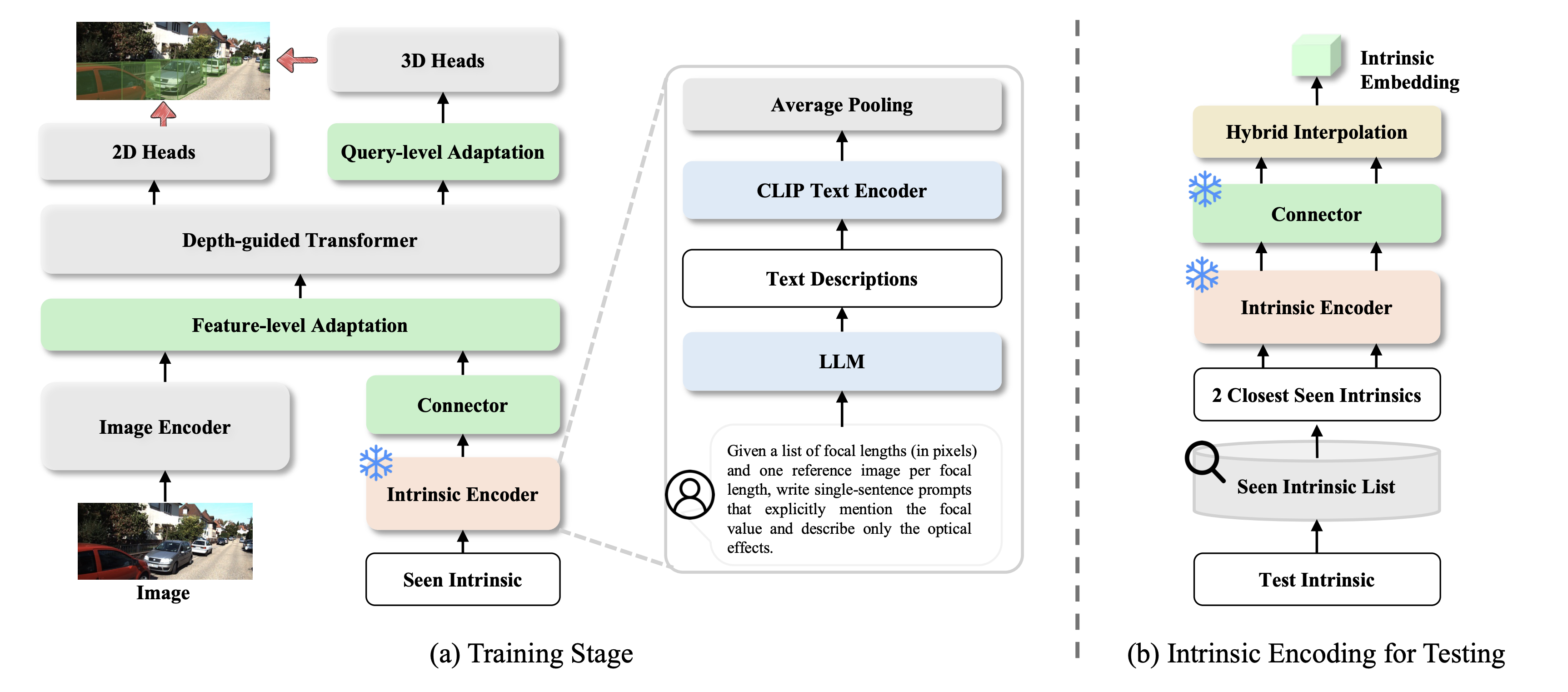 MonoIA is a unified intrinsic-aware detection framework built upon two designs. The Intrinsic Encoder leverages the knowledge of LLM and CLIP to convert numeric intrinsics into semantically meaningful embeddings that capture their perceptual and geometric effects, providing a strong prior for generalization across cameras. The Intrinsic Adaptation Module bridges this semantic knowledge with visual perception through a lightweight Connector and hierarchical fusion, enabling the detector to interpret visual features in an intrinsic-aware manner and maintain consistent 3D detection under diverse camera settings.