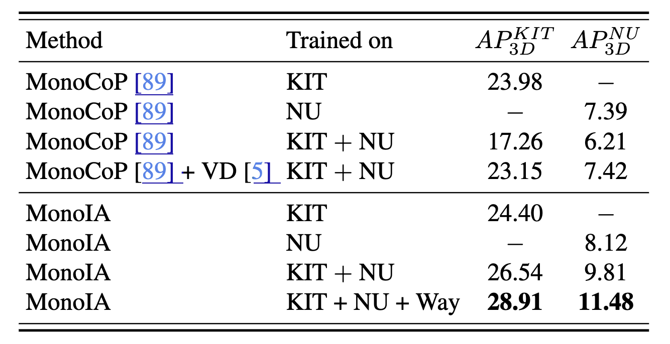 Our intrinsic-aware design helps bridge inter-dataset discrepancies especially for different focal lengths. So our MonoIA naturally supports multi-dataset training and further improves overall performance.