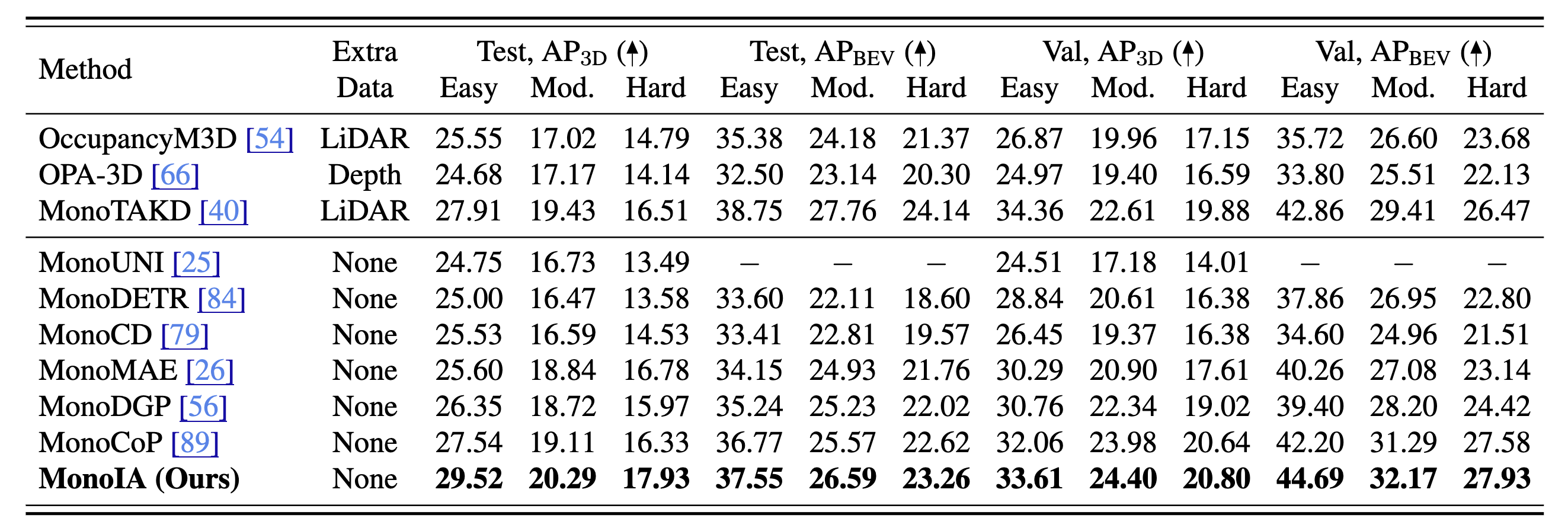 MonoIA achieves state-of-the-art performance across KITTI leaderboard and KITTI Validation set, demonstrating that our intrinsic aware design also improves standard 3D object detection benchmarks.